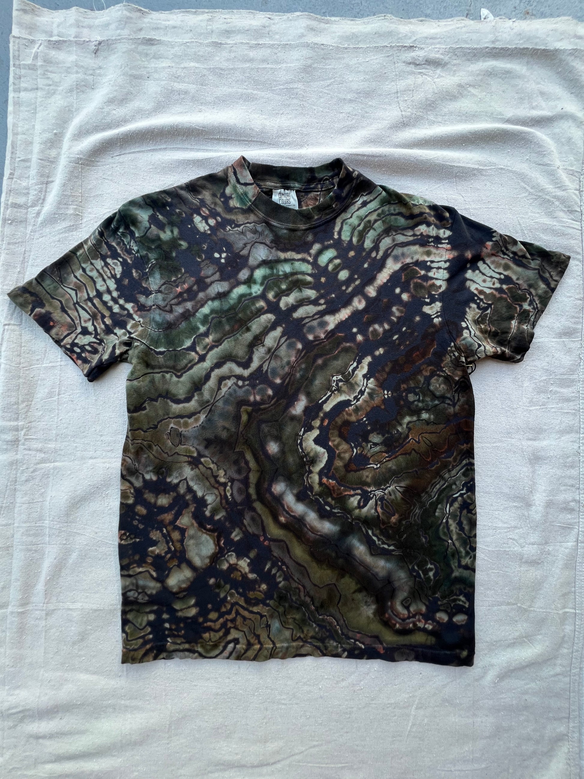 Unisex/Men's size M - earthy, camo inspired geode reverse tie dye crewneck t-shirt.